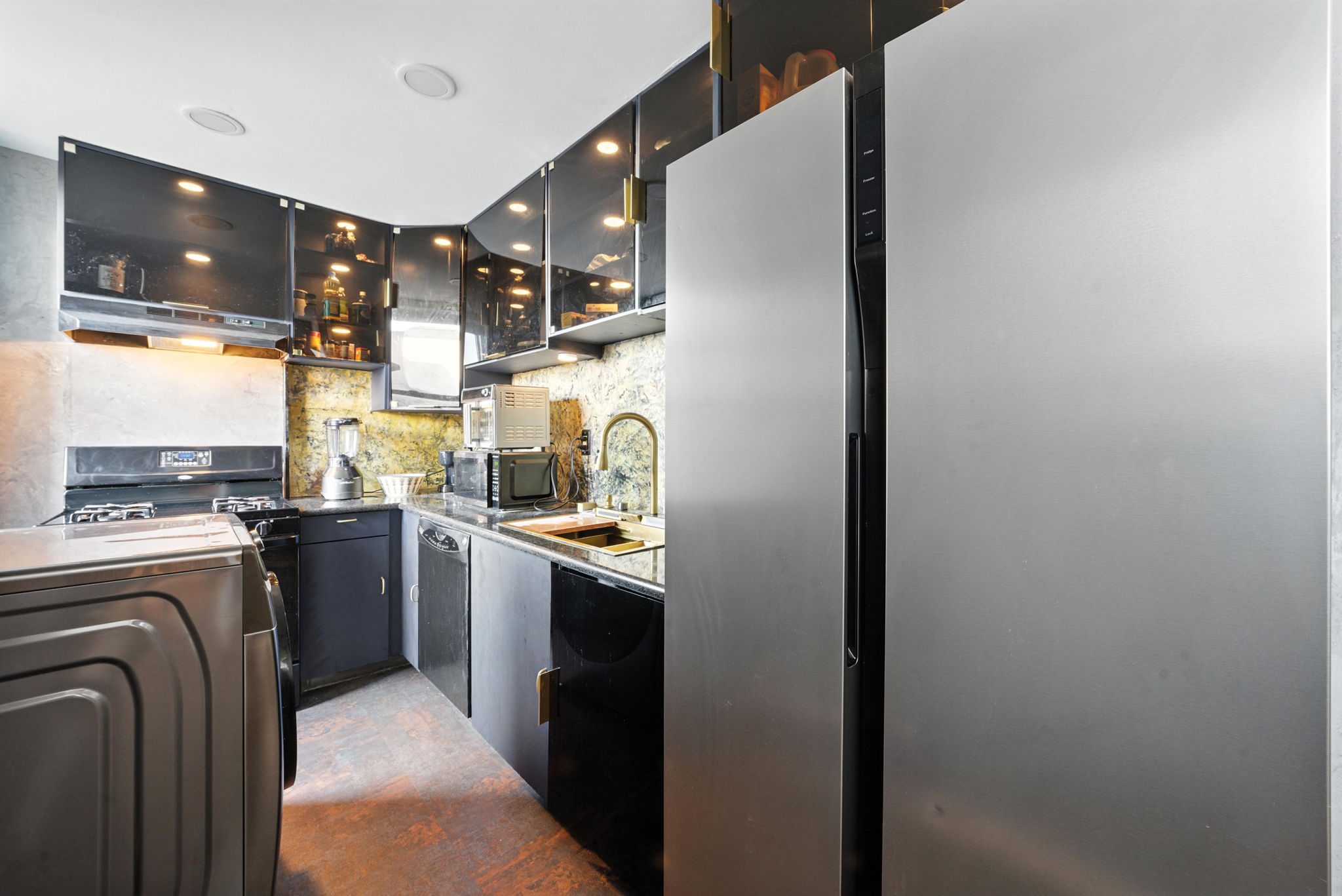 Step into sophisticated city living at Gothic Tower, a pre-war gem walking distance to the Journal Square PATH Station. This expansive 1-bedroom, 1-bath residence offers nearly 1,000 sq ft of modern elegance wrapped in timeless charm. Inside, you’ll find beautiful flooring, stunning Venetian plaster, marble walls, and natural stone walls that add texture and warmth. A smart voice and phone-enabled LED recessed lighting system lets you set the mood throughout the space. The fully renovated kitchen features translucent acrylic cabinet doors, LED-lit interiors, floating shelves, and new appliances perfect for stylish everyday living. The updated bathroom showcases gold accents throughout. Redwood polyurethane-finished doors, a mirrored living room closet, and gold outlets add rich design details throughout. In Gothic Tower, enjoy a 24-hour doorman, fitness center, courtyard, and laundry room, plus unbeatable access to St. Peter’s University, local cafes, parks, and NYC via PATH.